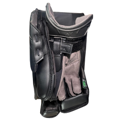 Starting with a new adjustable finger connection system. This allows for goalies to change the finger padding based on how a goalie holds their stick. If a goalie likes a squared paddle design, they can adjust the padding to work with a square paddle. If a goalie likes a steep paddle design, they can adjust the padding for a steep paddle.
