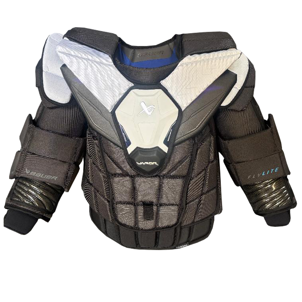 The Bauer Flylite Chest & Arm presents wide in the shoulder area for a goalie. It also presents large in volume in the front shoulder and sternum areas, which help add more protection to this unit. The sternum is reinforced with Bauers Aeorlite shield design. The arms of the Flylite have been reinforced with extra protection without losing mobility by incorporating CURV Composite and Shocklite foams.