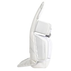 The Bauer Vapor HYP2RLITE is considered the hybrid style pad in the Bauer line. The Vapor HYP2RLITE pad has a great pre-curved “s” shape that allows just about any goalie to seal the five hole. Goalies with a narrow and medium butterfly width can use the Vapor pads and know they can still perform at the highest level. Bauer also uses a CURV Composite material in the thigh rise which keeps the thigh rise stiff and not does not become prone to becoming soft and sloppy over time. The Vapor HYP2RLITE goalie pad also has good lateral flex which again is ideal for the hybrid style goalie as the pad will move more independently (top, middle and bottom) compared to a stiffer blocking style pad. The boot of the Bauer Vapor HYP2RLITE pad uses a stock 110 degree break. Again this is the softest boot Bauer offers and it provides the most mobility possible.