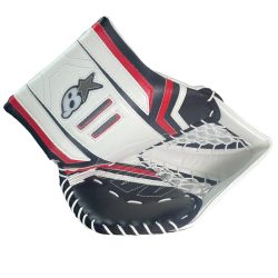 New for 2023 is the Brian’s Optik X3 junior goalie catch glove. This glove is ideal for younger goalies (generally 8 to 12 years olds) that play Rec thru AAA travel hockey levels. The break of the glove has a 40 degree closure angle. Internally the Optik X3 glove uses a no slip SBA synthetic interior liner material. This material allows the goalie to gain more control with their fingers and palm while squeezing the glove. The Optik X3 uses a traditional nylon wrist strap which is surrounded by a large SBA floating pad, this allows the goalie to lock down the glove with comfort. Across the back of the hand is another locking strap which is surrounded with a large padded air-knit material. The finger stalls also utilize an air-knit material for durability and comfort. The catching surface has a huge single t pocket with a deep thumb angle makes catching the puck very easy on this glove. Proportionately, Brian’s has done a very good job scaling this glove down compared to the intermediate size.
