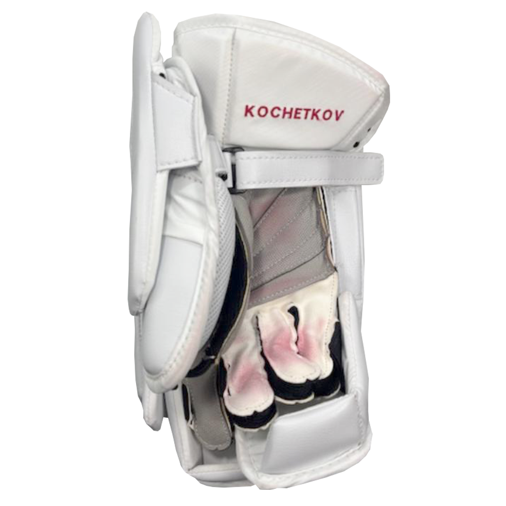 Goalies Plus has a used set of Pyotr Kochetkov Pro Return goalie leg pads, blocker & glove. These are real pro return pads that were actually built and demo’d by Pyotr Kochetkov of the Carolina Hurricanes. Everything has been used maybe five times – basically brand new. Pad core is still very stiff.