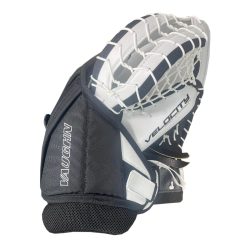 This glove has a one-piece cuff design however it keeps the break internally on the V10 glove. This allows the goalie to have maximum surface area while maintaining wrist flexibility. The wrist flexibility is popular among goalies who stick handle with the pocket of the glove in a downward position. In this downward position the goalie needs a good bit of wrist movement to be able to properly play the puck. The Velocity V10 glove will use a wider and deeper split T with a U-shaped pocket in the V10 catch glove. At the base of the pocket there is a single t that splits into a double T the higher it goes in the pocket. The U-shaped design with the single T at the base allows the glove much more flexibility than a traditional glove with a double T going the entire way to the base of the pocket. As the pocket transitions from the single T at the base to the double T in the pocket, the glove becomes very soft and deep in the main catching area of the glove. The Velocity V10 Pro Carbon glove can be heat molded for a customized fit.