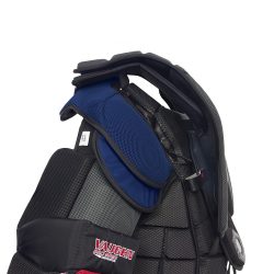 The neckline has been moved up on the Velocity V10 Pro Chest & Arm Protector. Some goalies have complained in the past that Vaughn chest protectors expose the collar bone. This has been addressed in the V10 and now sits higher. There is a vertical adjustment on the V10 the allows the goalie to move the neckline up or down based on their preference.