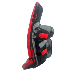 The Warrior G7 leg pads have a reinforced thigh rise, making the pads stiff from the bottom of the knee on up. In the shin area of the pads, Warrior is using carbon composite high density foam which allows for an explosive rebound off the face of the pad. A single break below the knee and also on the vertical roll gives the pad a very nice vertical and lateral flex. These flexes are very important because it allows the pad to cover the five hole and not hinder skating movements. The vertical flex allows for butterfly coverage while the lateral (torsional) flex allows the pad to move when a goalie is skating and recovering.